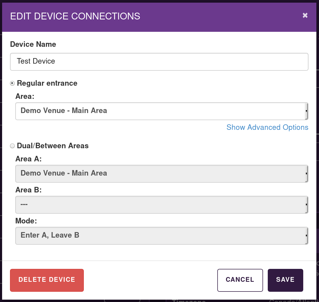 - Device is connected to two different rooms/areas, and depending on the mode selected, each button press removes one count from one room and adds it to the other (in "Enter A, Enter B" mode adds/removes 1 from both rooms).